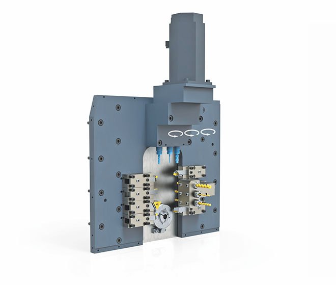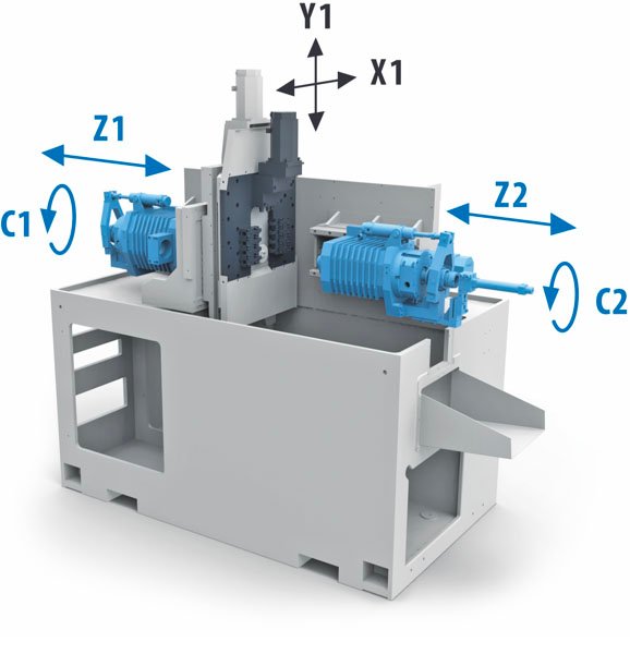 El contrahusillho, las herramientas accionadas y el cargador de barras ya están incluidos de serie en la máquina. Con 2 husillos, 3 herramientas accionadas, ejes C y hasta 12 herramientas estacionarias, la K'MX 413 también es capaz de producir piezas complejas. Con esta máquina queremos ofrecer una solución económica, fiable y sencilla. Cuatro ejes lineales CNC (X1, Y1, Z1, Z2), dos ejes rotativos (C1, C2).