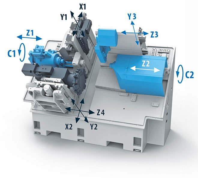 La macchina è equipaggiata di serie con due mandrini elettrici con velocità massima di 12.000 giri / min e una bussola di guida rotante sincronizzata con il mandrino principale tramite pulegge e cinghie. La torretta a revolver Baruffaldi con 12 posizioni utensile con attacco VDI 20 consente due operazioni differenti di tornitura contemporaneamente sul mandrino principale grazie all'asse Z4. Il design consente di utilizzare fino a 4 utensili contemporaneamente.